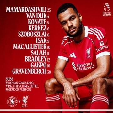 利物浦首发:25-马马尔达什维利、6-凯尔凯兹、4-范戴克、5-科纳特、12-康纳-布拉德利、38-赫拉芬贝赫、10-麦卡利斯特、8-索博斯洛伊、18-加克波、11-萨拉赫、9-伊萨克