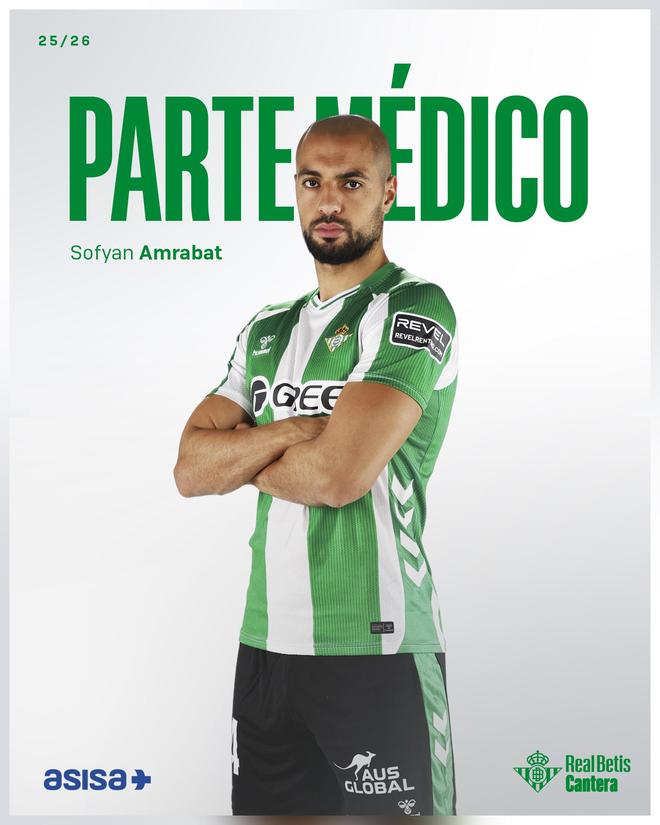 本周中皇家贝蒂斯对阵卢多戈雷茨的欧联比赛中,阿姆拉巴特于下半场第76分钟替补登场,但在比赛中与对手相撞,随后被诊断为右股直肌筋膜损伤。