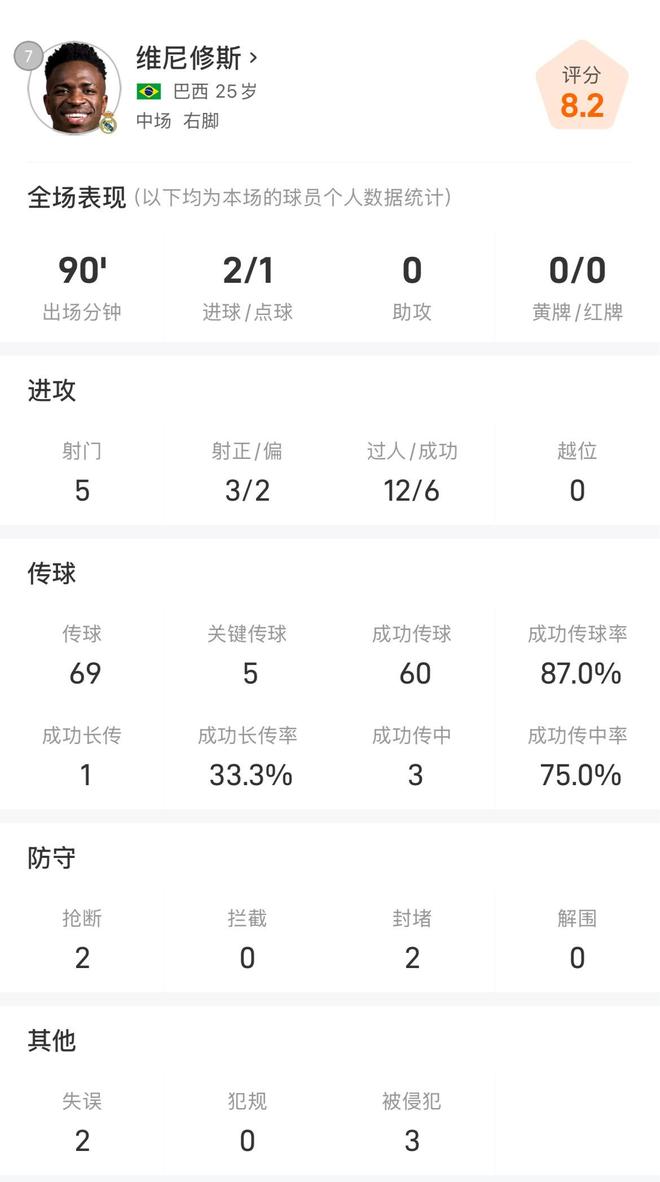 此役维尼修斯首发并踢满全场,打入两粒进球,造成对手一粒点球和一张红牌。全场比赛维尼修斯5次射门3次射正,12次尝试过人,6次成功,送出5次关键传球。69次传球,60次成功,传球成功率高达87%,防守端贡献2次抢断,赛后机器评分8.2分。